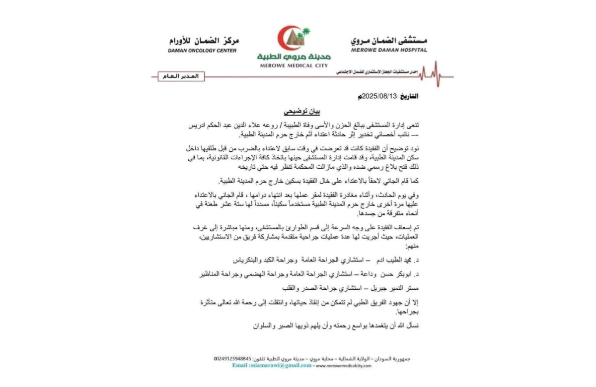 أعلنت إدارة مستشفى الضمان مروي ومركز الضمان للأورام، وفاة طبيبة أخصائي الجراحة العامة، متأثرة بإصاباتها عقب تعرضها لاعتداء عنيف خارج حرم مدينة مروي الطبية.