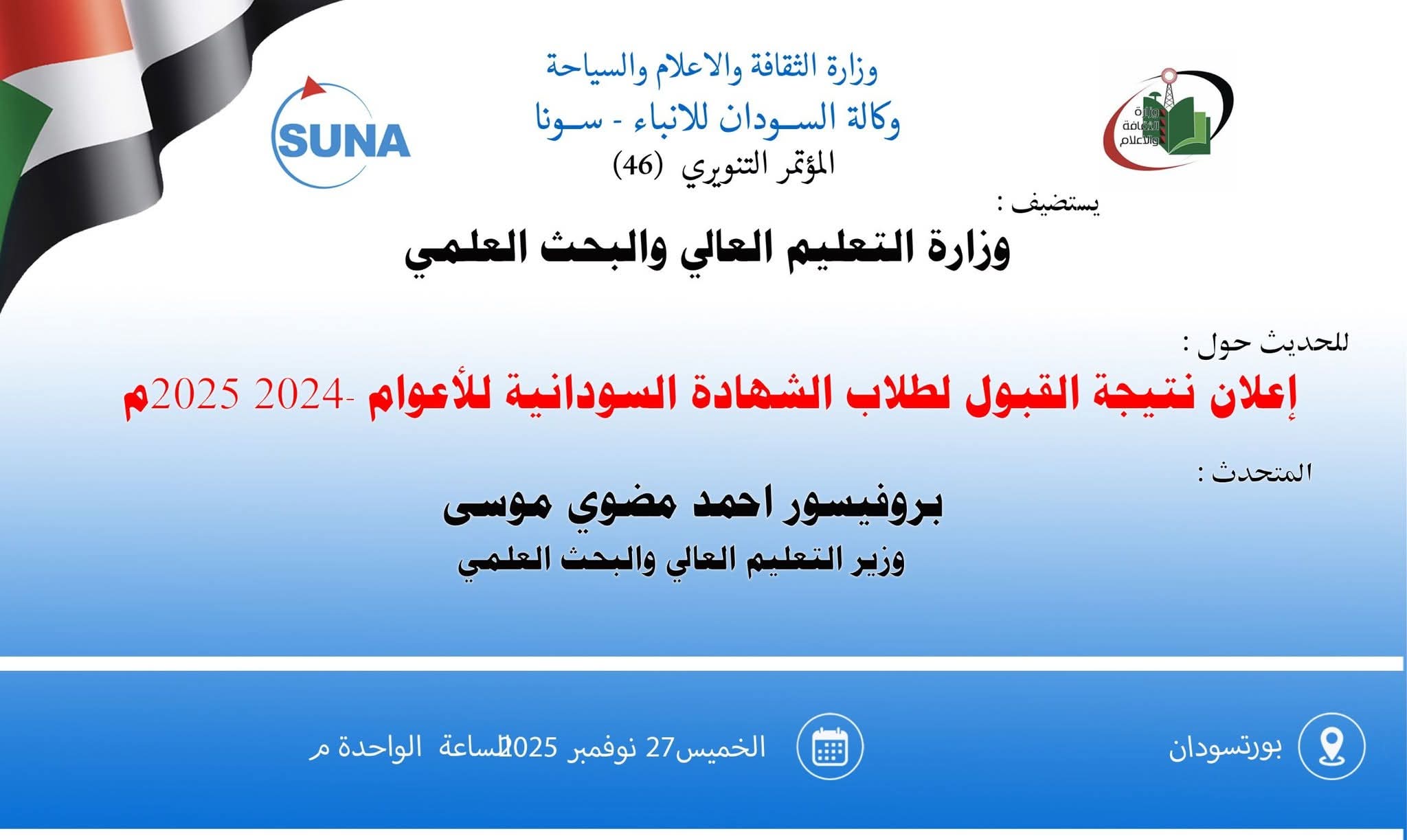 بورتسودان 26-11-2025 – تستضيف وكالة السودان للأنباء غدًا الخميس المؤتمر التنويري رقم (47) لوزارة الثقافة والإعلام والسياحة، في تمام الساعة الواحدة ظهرًا بقاعة المختبرات بمدينة بورتسودان، بالتعاون مع وزارة التعليم العالي والبحث العلمي، لإعلان نتيجة القبول لطلاب الشهادة السودانية للعام الجامعي 2024–2025م.