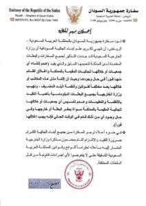 شدد الإعلان على أن أي مكاتب أو تجمعات قائمة حالياً للجالية السودانية، سواء داخل مقر البعثة أو خارجها، يجب إغلاقها فوراً إذا كانت تخالف الأنظمة المعمول بها في المملكة.