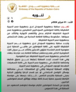 أصدرت سفارة جمهورية السودان لدى جمهورية مصر العربية تنويهاً مهماً دعت فيه جميع المواطنين السودانيين المقيمين في مصر إلى ضرورة الالتزام بحمل وثائقهم الثبوتية والتأكد من سريانها، تفادياً لأي إشكالات قانونية.