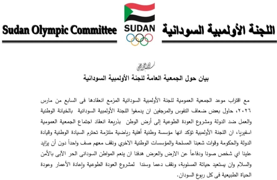 أكدت اللجنة الأولمبية السودانية التزامها الكامل بالسيادة الوطنية ودعمها لمؤسسات الدولة، مشددة على أن انعقاد جمعيتها العمومية المقرر في السابع من مارس 2026 سيتم وفق المعايير الدولية وبمتابعة من الجهات الأولمبية المختصة.