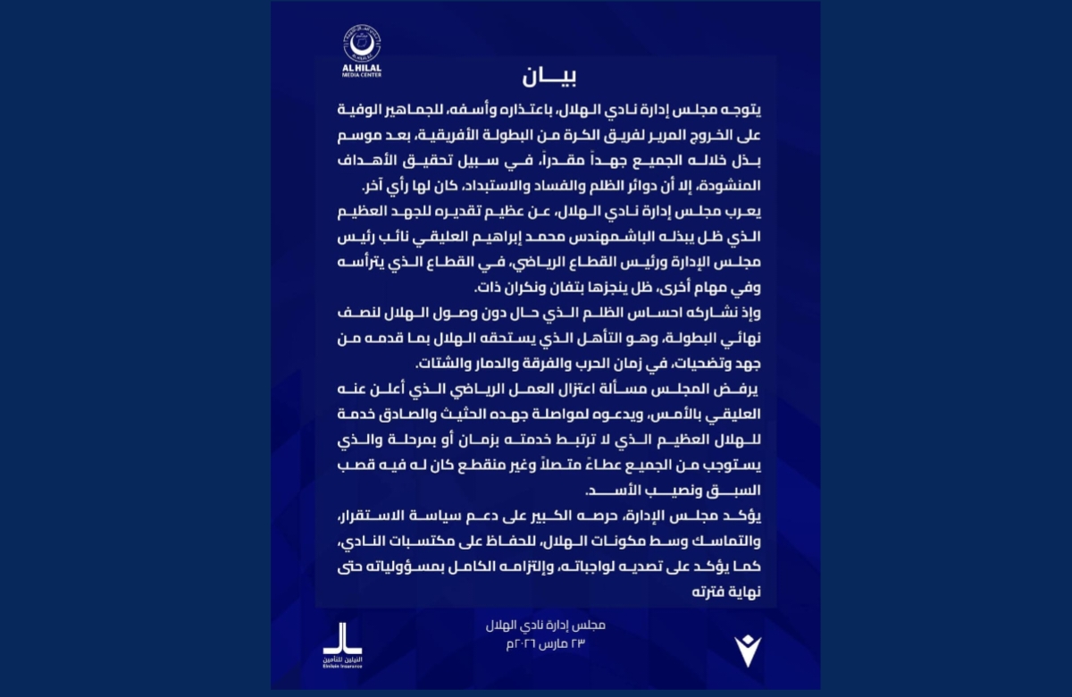 يتوجه مجلس إدارة نادي الهلال، باعتذاره وأسفه، للجماهير الوفية على الخروج المرير لفريق الكرة من البطولة الإفريقية، بعد موسم بذل خلاله الجميع جهداً مقدراً في سبيل تحقيق الأهداف المنشودة، إلا أن دوائر الظلم والفساد والاستبداد كان لها رأي آخر.