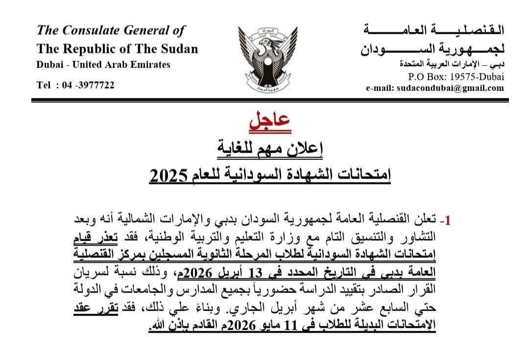 أعلنت القنصلية العامة لجمهورية السودان في دبي والإمارات الشمالية عن تأجيل امتحانات الشهادة السودانية للعام 2025، والتي كان من المقرر انعقادها في 13 أبريل 2026، وذلك نتيجة تعذر إقامتها في موعدها المحدد.